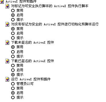 | internet选项 -> 安全 -> 自定义级别,弹出设置窗体,其中ActiveX控件和插件选项是否如下图所示: |
